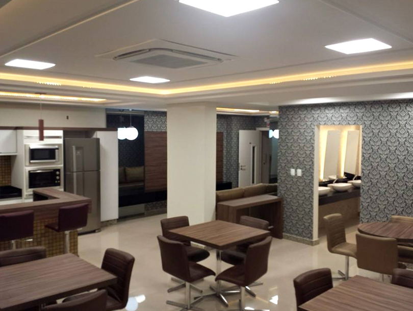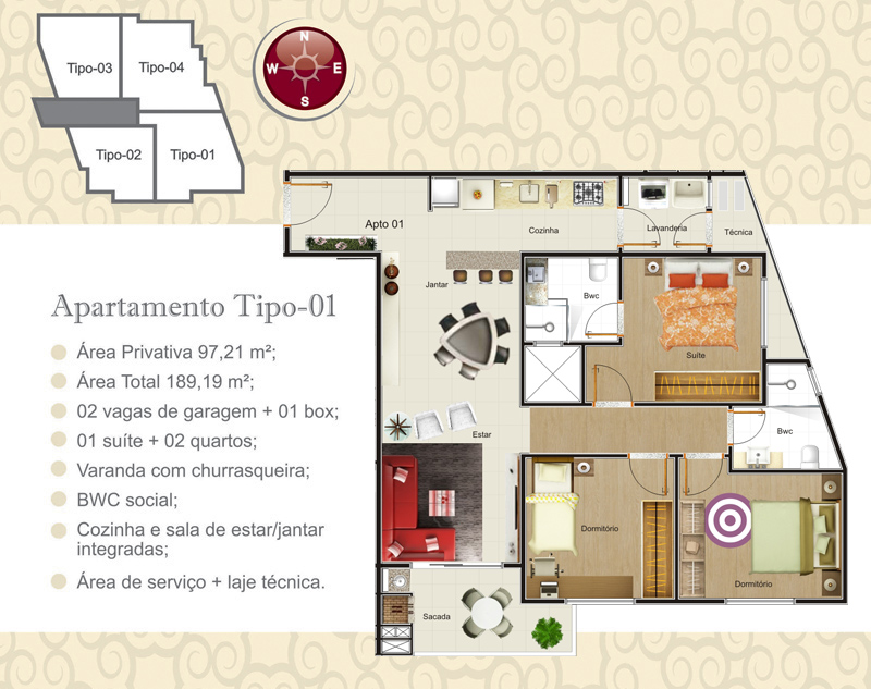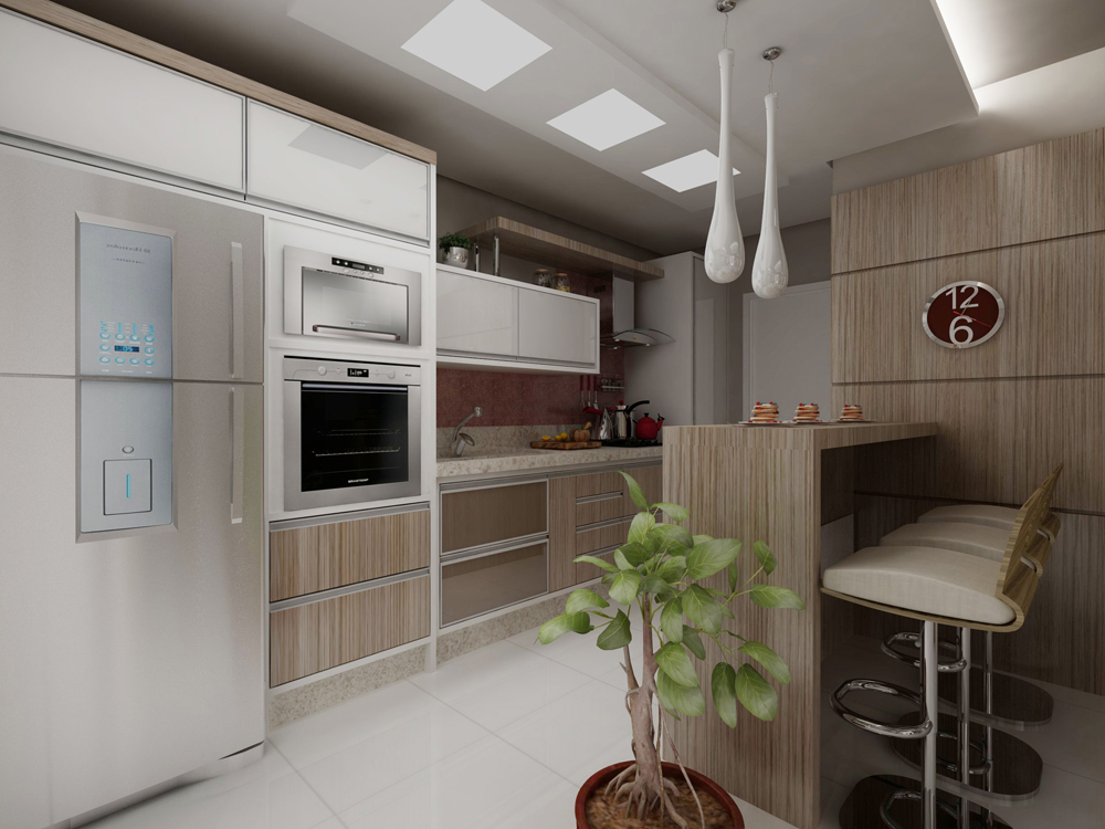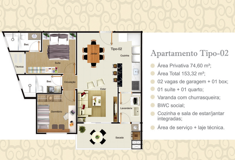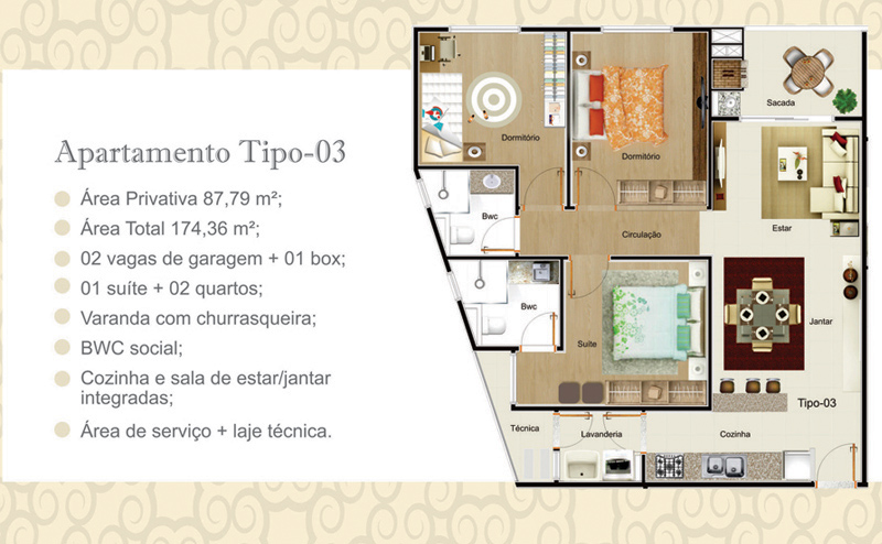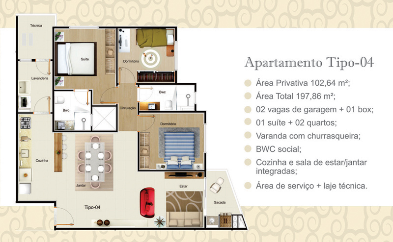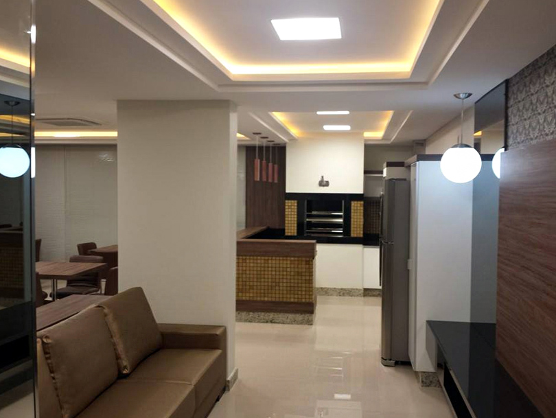 Aquecimento de água a gás (cozinha e banheiros) | infraestrutura para instalação de arcondicionado split (quartos e sala) | varanda com churrasqueira | laje técnica | ambiente integrado (cozinha e sala) | janelas em alumínio | piso laminado nos quartos, porcelanato nos demais ambientes | área de serviço | medidor de água e gás individual | rebaixamento de gesso e acabamento em massa corrida |